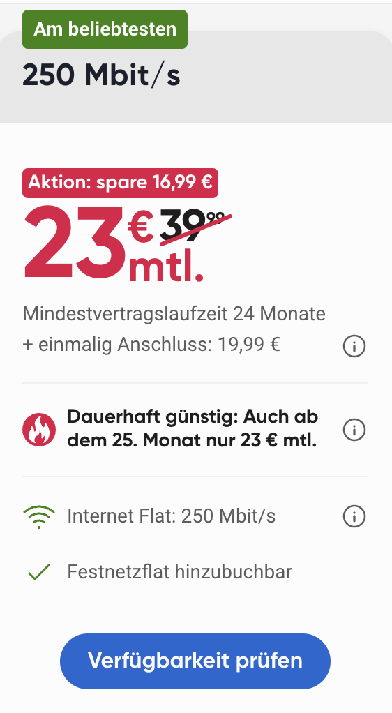 Aktion: Dauerhaft monatlich 23€ Grundgebühr anstelle von 39,99€ für die Internetleitung mit 250 Mbit/s im Download. Mindestvertragslaufzeit 24 Monate. Verlängerungslaufzeit 1 Monat. Kündigungsfrist 4 Wochen. Zuzüglich 19,99€ Aktivierungsgebühr.